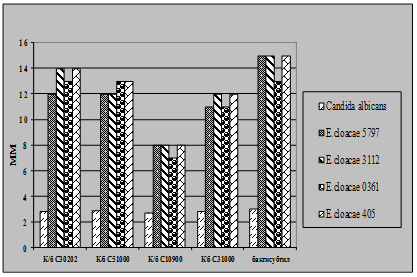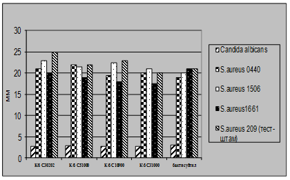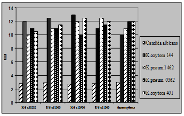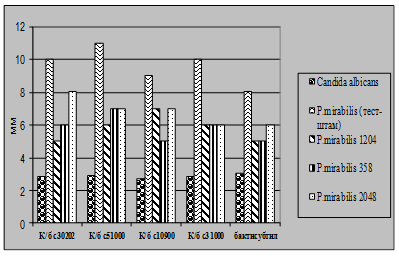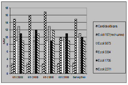 На підставі аналізу, що представлений в таблиці 3.1., можна зробити висновок про те, що тест-культури Candida albicans, як обов`язковий тест-мікроорганізм має мінімальне пригнічення росту. З нашої точки зору це обумовлено філогенетичною стійкістю цієї культури до природних антибіотичних чинників, а також малою швидкістю росту самого мікроорганізму.