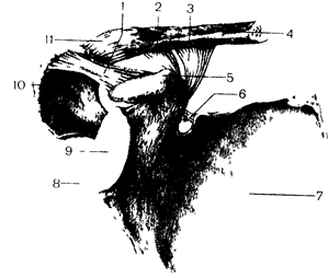 1 –lig . coracoacromiale; 2 – li g. trapezoideum ; 3 – li g. conoideum ; 4 - extremitasacromialis claviculae ; 5 - processus coracoideus ; 6 – li g. transversum scapulae superius ; 7 – scapula; 8 - labrum glenoidale; 9 -cavitas glenoidalis ; 10–acromion; 11 – art. acromioclavicularis .