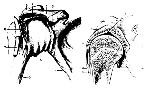 1 - processus coracoideus; 2, 5 - tendo m. bicipitis brachii (caput longum); 3 - cavitas glenoidalis; 4 - capsula articularis; 6 - vagina synovialis intertubercularis; 7 - caput humeri; 8 - lig. coracohumerale.
