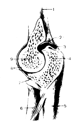 1 - humerus; 2 - cavitas articulare; 3 - capsula articularis; 4 - olecranon; 5 - ulna; 6 - radius; 7 - processus coronoideus; 8 - cartilago articulari s; 9 - trochlea humeri.