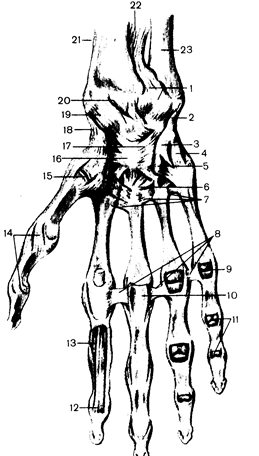 1 - art. radioulnaris distalis; 2 - lig. collaterale carpi ulnare; 3 - lig. pisohamatum; 4 - lig. pisometacarpale; 5 -hamulus ossis hamati; 6 - ligg. carpometacarpalia palmaria; 7—ligg. metacarpalia palmaria; 8 - ligg. metacarpalia transversa profunda; 9 - art. metacarpophalangealis (вскрыт); 10 - vagina fibrosa digitorum manus (вскрыта); 11 - art. interphalangeales (вскрыты); 12 - te ndom. flexoris digitorum profundi; 13 -tendo m. flexoris digitorum superficialis; 14 - ligg. collateralia; 15 - art. carpometacarpalis pollicis; 16 - os capitatum; 17 - lig. carpi radiatum; 18 - lig. collaterale carpi radiale; 19 - lig. radiocarpale palmare; 20 - os lunatum; 21 - radius; 22 - membrana interossea antebrachii; 23 — ulna.