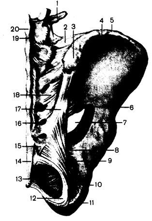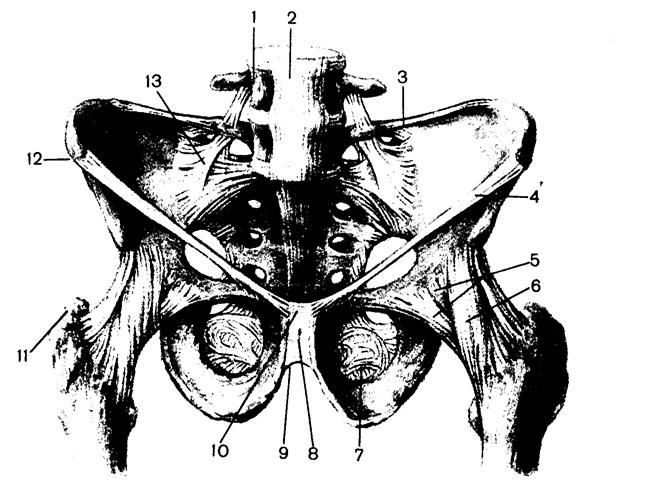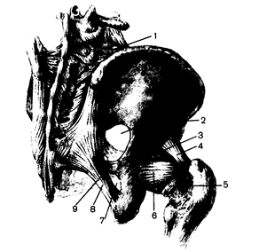 1 - lig. iliolumbale; 2 - for. ischiadicurn majus; 3 -caput ossis femoris; 4 - lig. iliofemorale; 5 - zona orbicularis; 6 - lig. ischiofemorale; 7 - for. ischiadicurn minus; 8 - lig. sacrotuberale; 9 - lig. sacrospinale.