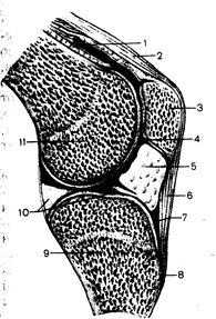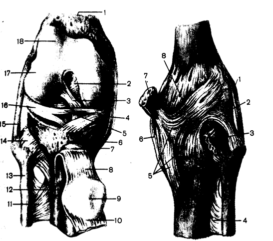 1 -os femoris; 2 -lig. cruciatum posterius: 3 -lig. cruciatum anterius; 4 - meniscus rnedialis; 5 - lig. transversum genus; 6 - lig. collaterale tibiale; 7 - bursa infrapatellaris profunda; 8 - lig. patellae; 9 - facies articularis patellae; 10 - tendom. quadricipitis femoris; 11 - membrana interossea cruris; 12 - tibia; 13 - fibula; 14 - lig. capitis fibulae anterius; 15 - lig. collaterale fibulare; 16 - meniscus lateralis; 17 - condylus lateralis; 18 - facies patellaris.