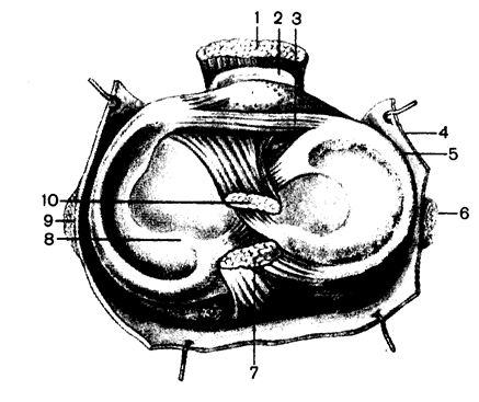 1 -lig. patellare; 2 -bursa infrapatellaris profunda; 3 - lig. transversurn genus; 4 -capsula articularis; 5 - meniscus lateralis; 6 - lig. collaterale fibulare (перерезана) ; 7 -l ig. cruciatum posterius; 8 - meniscus medialis; 9 - lig. collaterale tibiale (перерезана); 10 - lig. cruciatum anterius.
