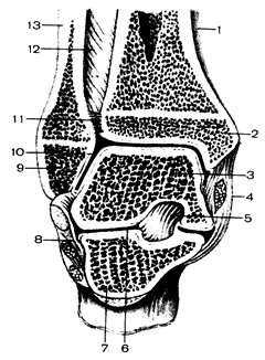 1 - tibia; 2 - malleolusmedialis; 3 - -talus; 4 - pars tibiocalcanea lig. m. deltoideum; 5 - lig. talocalcaneum interosseum; 6 - articulatio subtalaris; 7 - calcaneus; 8 - capsula articularis; 9 - malleolus lateralis; 10 - articulatio talocruralis; 11 - syndesmosis [articulatio] tibiofibularis; 12 - mernbrana interosseacruris; 13 - fibula.