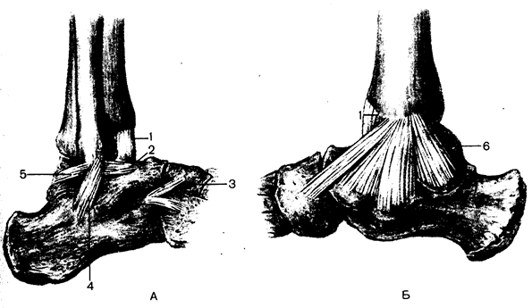 А - вид снаружи. Б - вид изнутри. 1 -capsula articularis; 2 - lig. talofibullare anterius; 3 - lig. bifurcatum; 4 - lig. calcaneofibulare; 5 - lig. talofibulare posterius; 6 - lig. mediale (deltoideum).