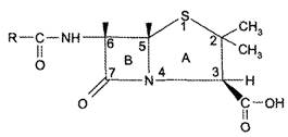 В основе строения пенициллинов лежит 6-АПК, которая представляет собой гетероциклическую систему, состоящую из 2 конденсированных колец: четырехчленного - β-лактамного (В) и пятичленного — тиазолидинового (А) (рис. 2). 6-AПК является дипептидом, состоящим из L-цистеина и L-валина.