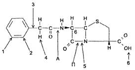 6 - заместитель в карбоксильной группе дает возможность получения солевых форм пенициллинов; П - пенициллиназа расщепляет β-лактамное ядро; А - амидаза расщепляет амидную связь.