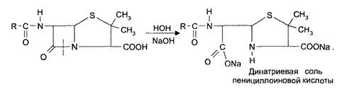 Наиболее лабильной частью молекулы пенициллина является β-лактамное кольцо, которое подвергается гидролитическому расщеплению под действием щелочей, кислот, фермента пенициллиназы с потерей биологической активности (рис. 4).