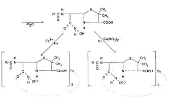 Гидроксамовая реакция основана на наличии β-лактамного кольца в молекуле пенициллина. При взаимодействии пенициллинов со щелочным раствором гидроксиламина гидрохлорида происходит реакция гидроксиламинолиза с образованием гидроксамовой кислоты, которая после подкисления образует окрашенные комплексные соли с солями тяжелых металлов: с солями железа (Ш) фиолетового цвета раствор гидроксамата железа (III) и зеленого цвета осадок гидроксамата меди (II) (рис. 5).