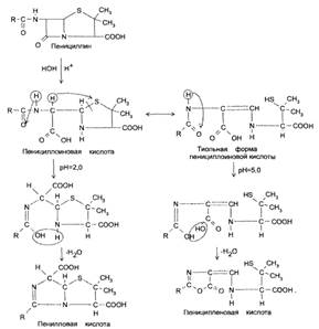 Под действием кислот пенициллины инактивируются с образованием пенилловой (при рН 2,0) и пеницилленовой (при рН 5,0) кислот. В обоих случаях на 1-м этапе расщепляется β-лактамный цикл с образованием пенициллоиновой кислоты.