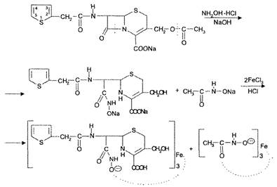 Гидроксамовая реакция проводится по методике для пенициллинов. Цефалотин, кроме того, дает гидроксамовуго реакцию и на сложноэфирную группу: