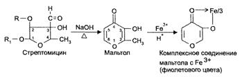 Стрептомицин, в отличие от других аминогликозидов, подвергается гидролитическому расщеплению не только в кислой, но и в щелочной среде. При щелочном гидролизе стрептомицина при нагревании из остатка L-стрептозы образуется мальтол, который открывается с образованием окрашенного в фиолетовый цвет комплекса с солями железа (Ш). Эта реакция используется для идентификации и количественною определения препарата. Кроме того, при щелочном гидролизе из остатков гуанидина выделяется аммиак, который обнаруживают по запаху и по посинению влажной красной лакмусовой бумаги.