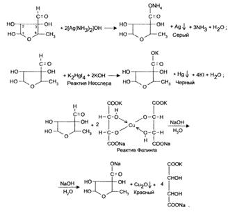 Наличие свободной альдегидной группы в остатке L-стрептозы молекулы стрептомицина обусловливает ряд характерных реакций: окисления — за счет восстанавливающих свойств альдегидной группы: с реактивом Фелинга образуется красный осадок оксида меди (I), с аммиачным раствором серебра нитрата — «серебряное зеркало» на стенках пробирки; с реактивом Несслера - темный осадок металлической ртути (1, 5).