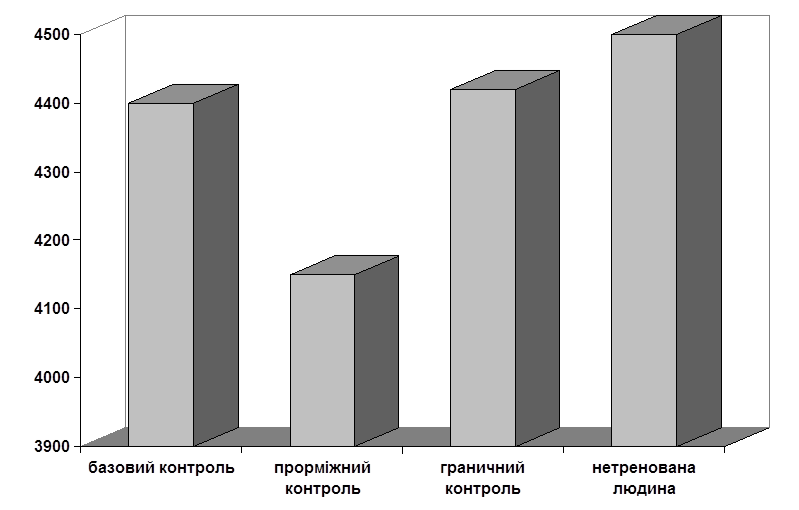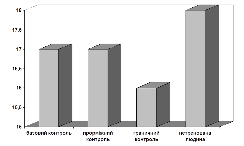 | Базовий контроль | Проміжний контроль | Граничний контроль | Базовий контроль | Проміжний контроль | Граничний контроль | ЧСС в спокої за 15 с | ЖЕЛ, мл | ||