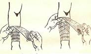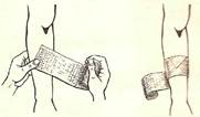 В качестве примера приведу пример лонгетно - циркулярной повязки при переломе голени. Тактика моя такова: объясняю больному предстоящую процедуру, затем предупреждаю медсестру с другого поста, что мне необходима ее помощь, заранее позаботившись, чтобы гипсовые бинты, вода, клеенка были наготове. Затем зову врача. Больного усаживаем на стуле или на краю кровати. Один из помощников удерживает конечность в вытянутом положении со стопой, установленной под прямым углом. На костные выступы кладем равномерный слой ваты, чтобы гипс не сдавливал По здоровой ноге отмеряем длину лангеты от кончиков пальцев до В/3 бедра, и раскатываем намоченные гипсовые бинты на клеенке в 6-8 слоев в зависимости от качества гипса каждый слой тщательно разглаживают руками, кладут слои друг на друга. Не давая гипсу застыть, лонгету переносим на пораженную часть тела, моделируем и фиксируем обычным бинтом (лангетная повязка). При накладывании лонгетно - циркулярной гипсовой повязки лонгету укрепляют спиральными ходами гипсовых бинтов. Помощник удерживает лангету всей ладонью, а не пальцами, во избежание вдавлений в гипсовой повязке, что в последствии может привести к ишемическим пузырям. При бинтование каждый следующий тур должен прикрывать предыдущий на 2/3 его ширины. Бинтование производят свободно, без натяжения, не допуская перегибов и складок; каждый новый слой разглаживают ладонью. До затвердения повязку тщательно моделируем в области костных выступов и месте перелома. Затем укладываем больного на кровать с подложенным под матрац деревянным щитом, так как на мягкой подстилке может измениться форма повязки. После наложения гипсовой повязки необходимо наблюдать, как за общим состоянием больного, так и за конечностью. Если больной жалуется на боли, чувство распирания в конечности, появился отек пальцев загипсованной конечности, синюшной окраски, похолодания, расстройств чувствительности, это указывает на сдавление конечности гипсовой повязкой, возникновение венозного застоя. Необходимо частично или полностью разрезать повязку, а края ее раздвинуть. При быстро нарастающем отеке следует немедленно рассечь повязку специальными приспособлениями (щипцы, отжим) Если пальцы становятся нормальной окраски, повязку закрепляют несколькими ходами гипсового бинта.