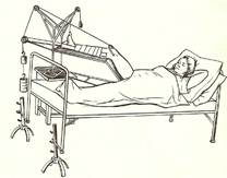 При переломах со значительным смещением отломков применяют метод скелетного вытяжения. Если эта процедура выполняется в отделении, я готовлю: шину Беллера, металлический трос, груз вес указывается врачом, упор, с помощью которого больной поднимается вверх. Эту манипуляцию проводит врач, перевязочная медсестра, я помогаю удерживать ногу больному. Врач