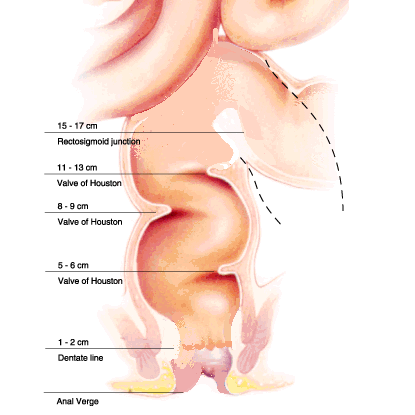 Прямая кишка является конечным отделом толстой кишки. Начало прямой кишки соответствует уровню верхнего края 3 крестцового позвонка. Как раз на этом примерно уровне и происходят те изменения в строении толстой кишки, которые отличают прямую кишку от вышележащих отделов: кишка постепенно теряет свою брыжейку; продольная мускулатура толстой кишки здесь распределяется равномерно по всей окружности, не образую трех лент, как на остальном протяжении кишки; Изменяется направление кровеносных сосудов - верхняя прямокишечная артерия дает ветви, идущие по кишке продольно; кишка с указанного уровня начинает расширяться.