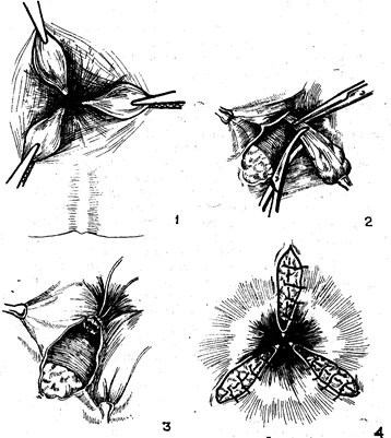 1. Геморроидальные узлы взяты зажимом Аллиса; 2 - узел выделен и на его основание наложен зажим Кохера; 3. После перевязки основания узел отсечен; 4. Общий виды после геморроидэктомии (швы на подслизистой).
