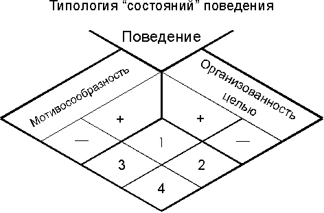 Фрустрация , как психическое состояние, возникает следствие конфликта между значимой для человека целью и невозможностью ее достижения. Это острое переживание неудачи на пути к цели. Обычно выделяют следующие виды фрустрационного поведения: а) двигательное возбуждение - бесцельные и неупорядоченные реакции; б) апатия (в исследовании Р. Баркера, Т. Дембо и К. Левина один из детей в фрустрирующей ситуации лег на пол и смотрел в потолок); в) агрессия и деструкция, г) стереотипия - тенденция к слепому повторению фиксированного поведения; д) регрессия, которая понимается либо "как обращение к поведенческим моделям, доминировавшим в более ранние периоды жизни индивида", либо как "примитивизация" поведения (измерявшаяся в эксперименте Р. Баркера, Т. Дембо и К. Левина снижением "конструктивности" поведения) или падение "качества исполнения". В соответствие с работами Василюка Ф.Е можно выделить два важнейших параметра, по которым должно характеризоваться поведение во фрустрирующей ситуации. Первый из них, который можно назвать "мотивосообразностью", заключается в наличии осмысленной перспективной связи поведения с мотивом, конституирующим психологическую ситуацию. Второй параметр - организованность поведения с какой бы то ни было целью, независимо от того, ведет ли достижение этой цели к реализации указанного мотива. Предполагая, что тот и другой параметры поведения могут в каждом отдельном случае иметь положительное либо отрицательное значение, т.е. что текущее поведение может быть либо упорядочено и организовано целью, либо дезорганизовано, и одновременно оно может быть либо сообразным мотиву, либо не быть таковым, получим следующую типологию возможных "состояний" поведения.