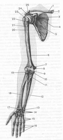 Вид спереди: 1 — ключица, 2 — грудинный конец ключицы, 3 — лопатка, 4 — клювовндный отросток лопатки, 5 — суставная впадина лопатки, 6 — плечевая кость, 7 — венечная ямкаплечевой кости, 8 — медиальный надмыщелок, 9— блок плечевой кости, 10— венечный отросток; 11— бугристость локтевой кости, 12 — локтевая кость, 13— головка локтевой кости, 14— кости запястья, 15 — I - IV пястные кости, 16 — фаланги пальцев, 17 — шиловидный отросток лучевой кости, 18 — лучевая кость, 19— головка лучевой кости, 20— гребень большого бугорка, 21 — межбугорковая борозда, 22 — большой бугорок, 23 — малый бугорок, 24— головка плечевой кости, 25— акромион