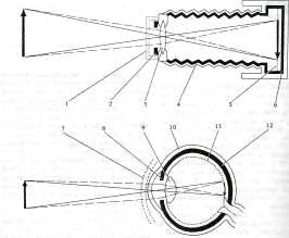 Рис. 1 . Схема, иллюстрирующая сходство между глазом и фотокамерой старого образца. 1 -затвор, ,2-диафрагма, 3-линза, 4-опорная структура, 5-светочувствительная пленка, 6-зачерненная поверхность, 7-веко, 5-радужка, 9-хрусталик, 10-склера, 11-сетчатка, 12-сосудистая оболочка.