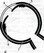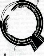 На рис. 2, Б видно, что средний слой лежит на внутренней поверхности опорного слоя. В двух задних третях глаза он состоит только из тонкой оболочки; этот тонкий задний участок называется сосудистой оболочкой (chorioidea). Кроме того, на том же рисунке можно видеть, что ближе к передней части глаза средний слой утолщается и образует так называемое цилиарное тело. В виде утолщенной кромки ткани оно окружает переднюю часть глаза. Отсюда внутрь идут так называемые цилиарные отростки (рис. 2, Б). Средний слой глаза продолжается вперед и составляет радужную оболочку, или радужку (диафрагму глаза).Радужка-это пигментированная часть глаза, которую можно видеть сквозь роговицу; в зависимости от того, какой пигмент она содержит, глаза представляются синими, карими или какого-либо другого цвета. Пигмент в изобилии содержится во всех частях среднего слоя; это способствует светонепроницаемости стенки глаза и снижает отражение. В среднем слое проходят кровеносные сосуды, а его передняя часть содержит гладкую мышцу. Гладкая мышца радужки регулирует диаметр отверстия глаза - его зрачка (см. рис. 12). Гладкая мышца ресничного тела меняет напряжение ресничного пояска (иногда называемого цинновой связкой хрусталика), но не таким способом, какой можно было бы ожидать на первый взгляд, т.е. ее сокращение не тянет волокна, на которых подвешен хрусталик, а ослабляет их напряжение, как будет описано ниже.