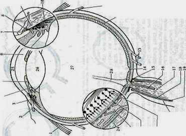 | 1 наружная мышца, 2-передняя цилиарная артерия, 3-цилиарное тело, 4-задняя камера, 5-радужка, 6-передняя камера, 7-шлеммов канал, 8-гребешковая связка, 9 - склеральная шпора, 10-цилиарная мышца, 11-вортексная вена, 12-сетчатка, 13-задние цилиарные артерии, 14-желтое пятно, 15-решетчатая пластинка склеры, 16-центральные сосуды сетчатки, 17-зрительный нерв, 18-мягкая мозговая оболочка, 19-паутинная оболочка, 20-твердая мозговая оболочка, 21-слоя нервных клеток, 22 - пигментный слой, 23 - сосудистая оболочка, 24-склера, 25-роговица, 26-хрусталик, 27-стекловидное тело, 23-канал Клоке. |