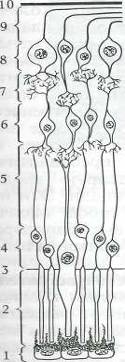 Пройдя через стекловидное тело и достигнув сетчатки, свет не сразу попадает на фоторецепторы, так как они лежат в глубине, где непосредственно примыкают к пигментному слою сет чатки. Чтобы достичь фоторецепторов, свет должен сначала пройти через слой нервных волокон и нервных клеток во внутренних частях сетчатки (частях, прилежавших к стекловидному телу). Затем, когда свет дойдет до фоторецепторов сетчатки и подействует на них, нервные импульсы, вызванные световым стимулом, должны пройти в обратном направлении через нервные волокна и тела нервных клеток к стекловидному телу. Здесь в ближайшем к нему слое сетчатки импульсы проводятся нервными волокнами, идущими к месту выхода зрительного нерва, по которому они достигают головного мозга (см. рис.4).