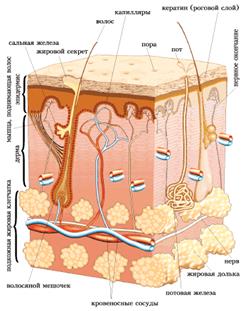 · Выделительная функция кожи : сальные и потовые железы обеспечивают вывод продуктов жизнедеятельности на поверхность кожи.