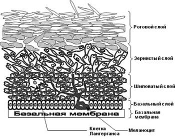 На базальной мембране находится слой зародышевых клеток, которые непрестанно делятся, обеспечивая обновление кожи. Среди зародышевых клеток располагаются крупные отросчатые клетки – меланоциты и клетки Лангерганса. Меланоциты производят гранулы пигмента меланина, который придает коже определенный оттенок, от золотистого до темного или даже черного.Клетки Лангерганса происходят из семейства макрофагов. Подобно макрофагам дермы они исполняют роль стражей порядка, то есть защищают кожу от внешнего вторжения и управляют деятельностью других клеток с помощью регуляторных молекул. Отростки клеток Лангерганса пронизывают все слои эпидермиса, достигая уровня рогового слоя.