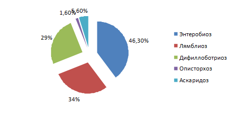 В ходе исследования была изучена структура и распространенность паразитарных инвазий в г. Абакане по данным за 2008 год (рис.2). Самой распространенной паразитарной инвазией в г. Абакане является энтеробиоз с удельным весом 46,3 %, на втором месте лямблиоз с удельным весом 34%, на третьем - дифиллоботриоз (29%). Наименьшая доля удельного веса приходится на описторхоз (5,6%) и аскаридоз (1,6%).