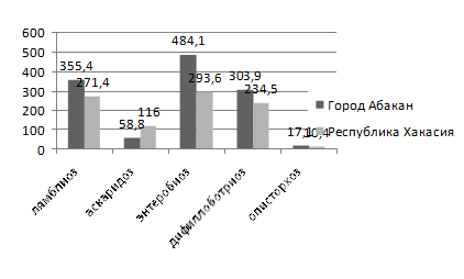 Заболеваемость энтеробиозом в г. Абакане составляет 484,1‰ и превышает среднереспубликанский показатель в 1,6 раза. Показатель лямблиоза составляет 293,6‰ с превышением среднереспубликанских данных в 1,3 раза. Заболеваемость дифиллоботриозом составляет 303,9‰ с превышением средних данных по республике в 1,3 раза. Наименьшие показатели приходятся на паразитозы как аскаридоз (58,8‰) и описторхоз (17,1‰). Превышение среднереспубликанских показателей по описторхозу составило в 1,6. Аскаридоз по анализу данных с показателем 116‰ по РХ в приоритете.