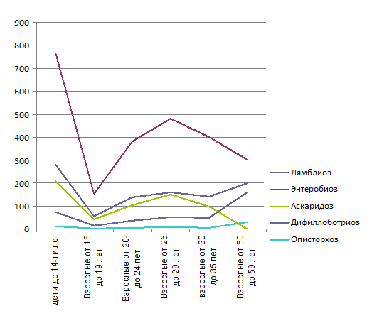 В выше указанных возрастных группах энтеробиоз (765‰-дети до 14 - ти лет и 303‰ - взрослые от 50 до 59 лет) и лямблиоз (279‰‰-дети до 14 - ти лет и 200,1‰ взрослые от 50 до 59 лет) наиболее распространенные паразитозы.