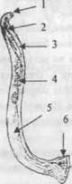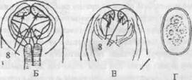(Ancylostoma duodenale) - А. Ротовые капсулы нека-тора { Necator americanus) - Б и кривоголовки - В; Г - яйцо кривоголовки; 1 - ротовая капсула; 2 - пищевод; 3 - кишечник; 4 - семенник; 5 - семяизверга-тельный канал; 6 - половая сумка; 7 - спикула, 8 - режущие пластинки и зубцы.