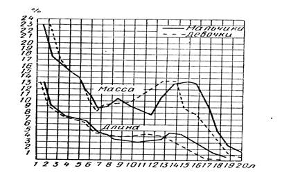 концу первого года жизни он достигает 75—80 см, т. е. увеличивается более чем на 50%; масса тела за год утраивается — при рождении ребенка она равна в среднем 3,0—3,2 кг, а к концу года — 9,5—10,0 кг. В последующие годы до периода полового созревания темп роста снижается и ежегодная прибавка массы составляет 1,5—2,0 кг, с увеличением длины тела на 4,0—5,0 см.