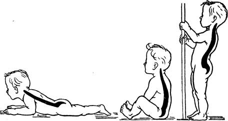 Структура тканей позвоночного столба существенно изменяется с возрастом. Окостенение, начинающееся еще во внутриутробном периоде, продолжается в течение всего детского возраста. До 14 лет окостеневают только средние части позвонков. В период полового созревания появляются новые точки окостенения в виде пластинок, которые сливаются с телом позвонка после ,20 лет. Процесс окостенения отдельных позвонков завершается с окончанием ростовых процессов — к 21—23 годам. Позднее окостенение позвоночника обусловливает его подвижность и гибкость в детском возрасте. Кривизна позвоночника, являющаяся его характерной особенностью, формируется в процессе индивидуального развития ребенка. В самом раннем возрасте, когда ребенок начинает держать головку, появляется шейный изгиб, направленный выпуклостью вперед (лордоз). К 6 месяцам, когда ребенок начинает сидеть, образуется грудной изгиб с выпуклостью назад (кифоз). Когда ребенок начинает стоять и ходить, образуется поясничный лордоз (рис. 2). С образованием поясничного лордоза центр тяжести перемещается кзади, препятствуя падению тела при вертикальном положении.