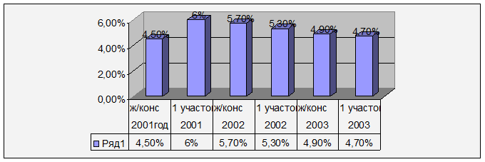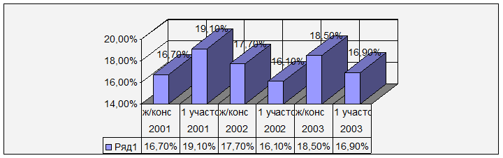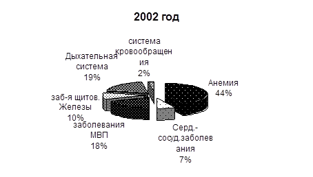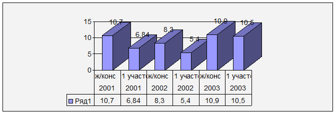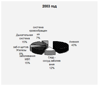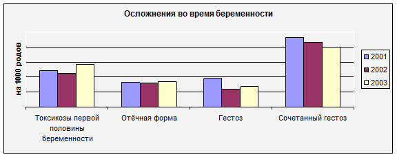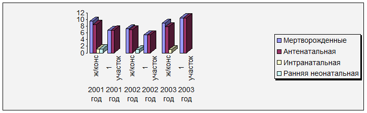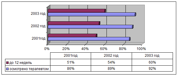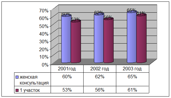 Моя работа представлена в виде таблиц и диаграмм, в которых отражены качественные показатели за период 2001-2003гг., а также, для сравнения, показатели по женской консультации.