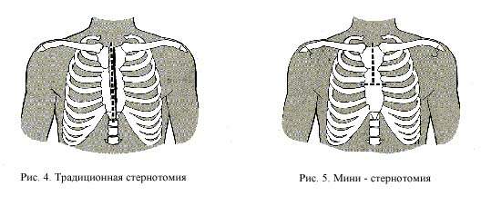 http://www.ecolink.ru/скачанное/medicinform3/cor4.jpgТрадиционное КШ выполняется через разрез на середине груди, называемый срединной стернотомией. Иногда можно выполнить министернотомию. Во время выполнения операции, сердце может быть остановлено. При этом поддержка кровообращения у пациента осуществляется с помощью искусственного кровообращения. Для этого работает аппарат сердце -легкие (аппарат искусственного кровообращения), который обеспечивает кровообращение во всем организме.