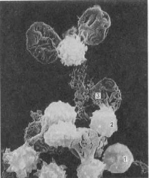 1 – эритроцит, 2 – сегментоядерный нейтрофильный гранулоцит,