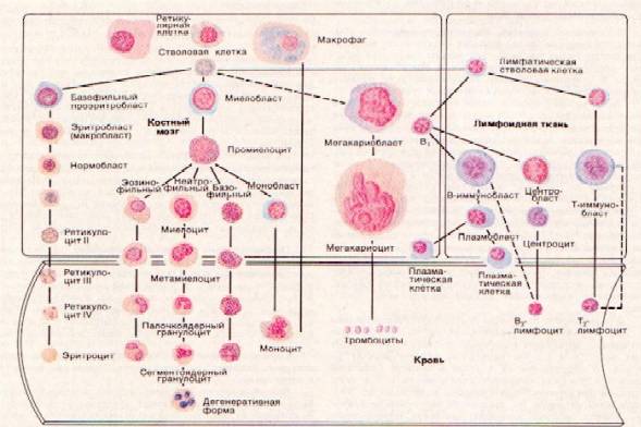 Все лейкоциты образуются в красном костном мозге из единой стволовой клетки. Предшественники лимфоцитов первыми ответвляются от общего древа стволовых клеток; формирование лимфоцитов происходит во вторичных лимфатических органах.