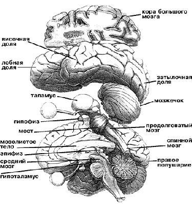 Как сейчас ясно, таких систем тонической деполяризации, или активации мозга (условно “центров бодрствования”), несколько - вероятно, пять или шесть. Располагаются они на всех уровнях мозговой оси: в ретикулярной формации ствола, в области голубого пятна и дорзальных ядер шва, в заднем гипоталамусе и базальных ядрах переднего мозга. Нейроны этих отделов выделяют медиаторы - глутаминовую и аспарагиновую кислоты, ацетилхолин, норадреналин, серотонин и гистамин, активность которых регулируют многочисленные пептиды, находящиеся с ними в одних и тех же везикулах. У человека нарушение деятельности любой из этих систем не компенсируется за счет других, несовместимо с сознанием и приводит к коме.