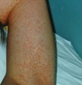 Сыпь состоит из множества сливающихся точечных элементов, расположенных на гиперемированном фоне. В связи с этим тело больного скарлатиной напоминает человека, которого окрасили с помощью кисти красной краской. Наиболее интенсивная по выраженности и количеству элементов экзантема отмечается на коже внутренних поверхностей бедер, нижней части живота и подмышечных областей. Особенно выраженное сгущение сыпи наблюдается в естественных складках подмышечных областей и локтевых ямок (симптом Пастиа). Интенсивность сыпи также более выражена при тяжелой форме заболевания, чем при легкой и среднетяжелой. При токсической скарлатине она нередко приобретает геморрагический характер. Сыпь практически всегда сопровождается зудом и поэтому на коже больных часто имеются расчесы. Экзантема, как правило, достигает максимальной выраженности на 2-3-й день болезни, а затем к концу недели постепенно угасает. На ее месте появляется шелушение кожи, интенсивность которого соответствует выраженности элементов сыпи. На туловище шелушение носит отрубевидный, а на ладонях, стопах и кончиках пальцев кистей и стоп пластинчатый характер. Следует иметь в виду, что сыпь при скарлатине не всегда имеет типичные проявления. В отдельных случаях она носит кореподобный характер. Иногда на шее, груди, животе экзантема сопровождается появлением мелких пузырьков, наполненных прозрачным содержимым. При скарлатине практически всегда отмечается белый дермографизм.