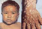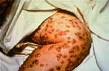 Теперь о внешней картине. Надо сказать, что она весьма неприглядна. На основании высокой заразности, тяжести течения и значительной летальности натуральная оспа отнесена в группу особо опасных карантинных инфекций, наряду с такими страшными заболеваниями как чума, сибирская язва, лихорадки Марбург и Эбола и т.д. Инкубационный период довольно длительный (до 18 дней, мы помним, что вирус должен подготовиться к штурму), заболевание начинается внезапно головной болью, болью в мышцах, высокой температурой (этот период совпадает со вторым массированным выходом оспы в кровь). Через 2-4 дня появляется сыпь, которая проходит в своем развитии несколько стадий - макулы (красного пятнышка на коже), папулы (образуется узелок), затем наступает стадия везикулы (пузырек с прозрачным содержимым), и, наконец, пустулы (пузырек с гнойным содержимым). На последней стадии пораженное место покрывается корочкой черного цвета (отсюда и название заболевания - черная оспа). После отпадения корочек на коже остаются рубцы, особенно заметные на лице. Весь период кожных высыпаний длится 3 недели. Характерно, что когда происходит кожное размножение вируса, температура тела у больных снижается по сравнению с лихорадочным периодом. Возможны 3 варианта развития заболевания. В случае "черной оспы" - наиболее тяжелой формы, летальность достигает 100%. Классическое течение заболевания вызывает смерть в 40% случаев. Variola (minor) вызывает более легкую формы заболевания - алястрим, - летальность при которой достигает 1-2%. Такая форма болезни обычно наблюдается у привитых против оспы людей.