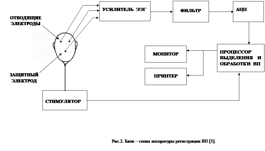 При регистрации от интактных покровов головы, как известно, регистрируется “спонтанная” электрическая активность в виде электроэнцефалограммы. Амплитуда ее в норме достигает 100 мкВ, а при патологии 200, 500 и даже 1000 мкВ. На этом фоне ВП, не превышающий в среднем в норме 15 мкВ, простым визуальным анализом выделен быть не может [3].