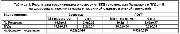 В настоящее время самым точным прибором измерения ВГД в офтальмологической практике считается тонометр Гольдмана, который и был использован в качестве эталонного при проведении сравнительных измерений. Паспортная погрешность тонометра ТГДц составляет ±2,0 мм рт.ст. на участке шкалы от 5 до 20 мм рт.ст. и 10 % на участке шкалы от 20 до 60 мм рт.ст. По данным литературы, отклонения показаний тонометра Гольдмана не превышают, как правило, ±2 мм рт.ст.