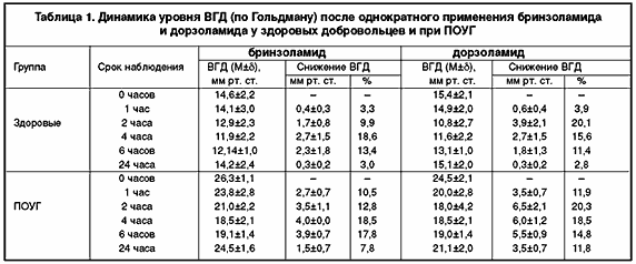 Исследование было проведено у 40 больных (20 здоровых добровольцев и 20 больных с некомпенсированной впервые выявленной ПОУГ в начальной стадии). ВГД измерялось после однократного закапывания исследуемых препаратов.