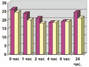 После однократного закапывания дорзоламида как у здоровых, так и у больных максимальное снижение ВГД соответствовало 2 часу исследования. В группе больных ПОУГ снижение ВГД было более выражено. Отмечалось сохранение гипотензивного эффекта через 24 часа. Динамика уровня была статистически достоверной (р > 95%), см. табл. 1.