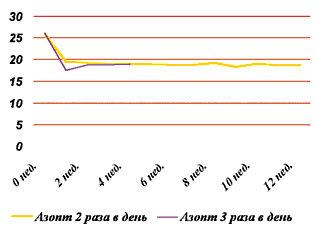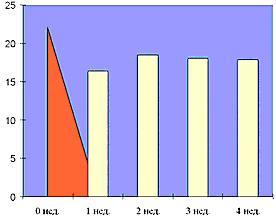 Во 2–й группе (бринзоламид 3 раза в день) начальное ВГД составляло 26,0±2,6 мм рт.ст. К концу 4–ой недели давление снизилось на 27% от первоначального уровня. Более наглядно еженедельную динамику ВГД на фоне применения исследуемого препарата в различных дозировках можно проследить на рис. 2. Изменение уровня ВГД было статистически достоверным (р > 95%).