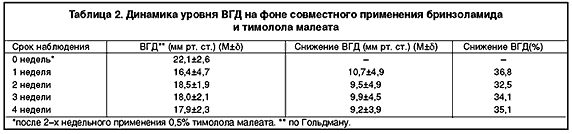 В ходе III этапа изучалась возможность комбинированного использования 1% бринзоламида и 0,5% тимолола малеата. До начала лечения уровень истинного ВГД составлял 27,6±2,5 мм рт. ст. Через 2 недели на фоне применения 0,5% тимолола малеата отмечалось его снижение на 5,4 мм рт.ст, что составило 18,6% от исходного уровня. У 20 отобранных больных компенсация ВГД на данном этапе исследования отсутствовала: ВГД составляло 22,1±2,6 мм рт.ст.